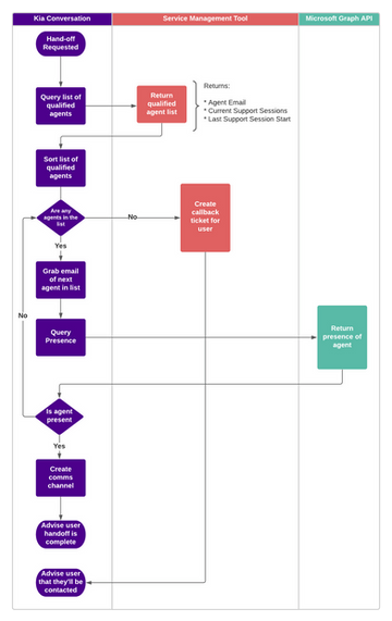 To give a bit more of an in-depth view into how Kia hands-off to a human agent, here’s a flowchart from the original development documentation followed by a description of how it all fits together.