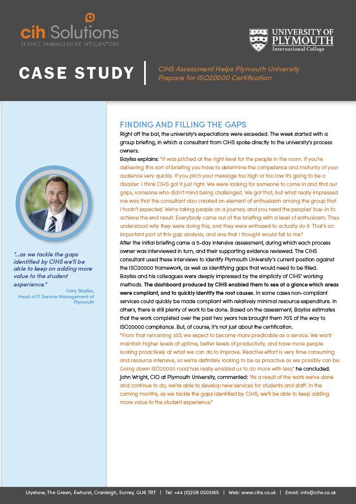 CIHS Assessment Helps Plymouth University prepare for ISO20000 Certification